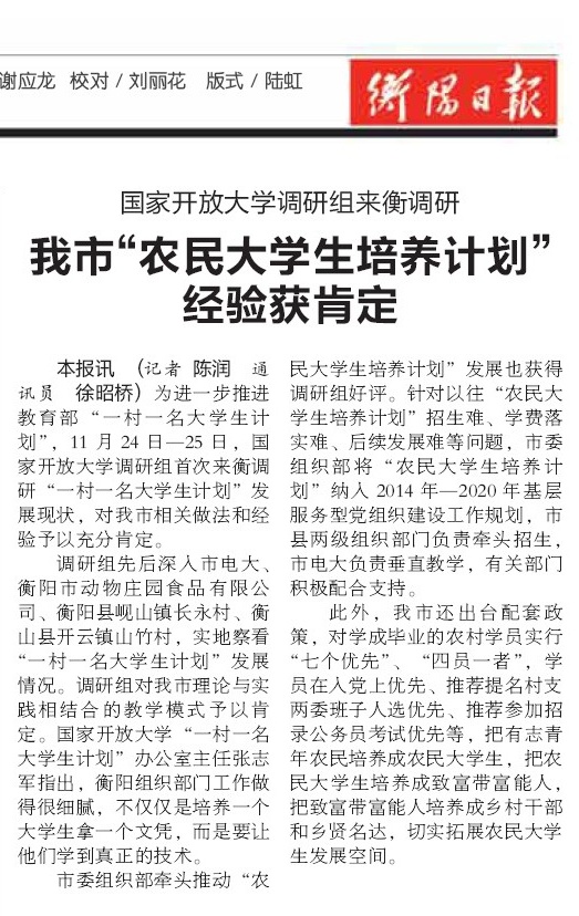 新闻标题:衡阳农民大学生培养工作获国家广播电视大学调研组肯定